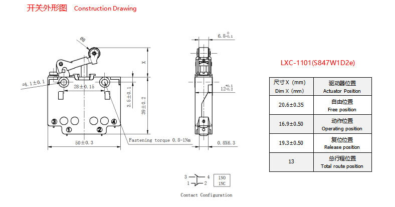 LXC系列限位开关采用加固设计,有较高的抗破坏能力,触点采用快速分合设计,即使用于驱动速度较慢的限位装置和机械检测等场合,也能保证较高的载荷能力。并具有强制分断装置,这保证了可靠的分断能力,甚至在过载或短路导致触点发生粘接的情况下仍然能强制分断,因此也特别适合用于对安全性能较高的场合。