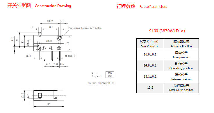 S100系列限位开关内部电连接件表面全部电镀纯银,具有接通可靠、载流能力强等特点。