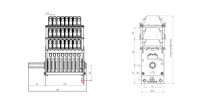 FC 系列辅助开关为间接带动式结构,通过六角轴旋转带动凸轮,然后由凸轮推动开关连杆,使动触片移动,实现接通或断开来控制电气回路。