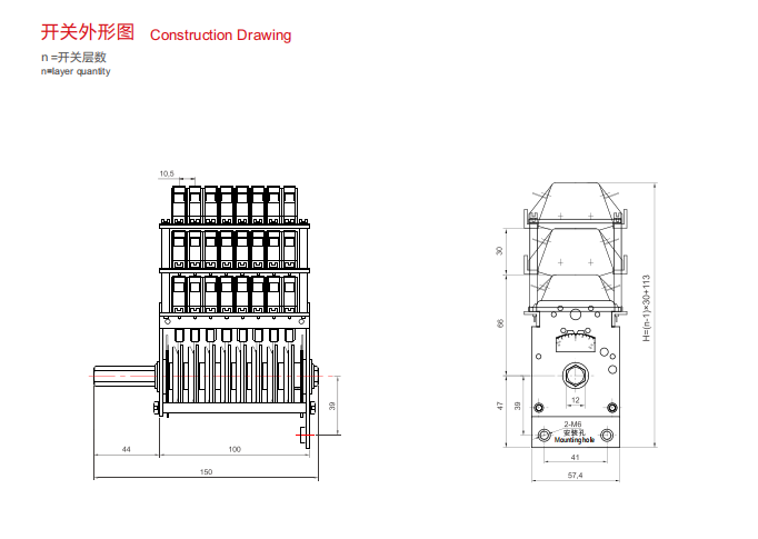 FC 系列辅助开关为间接带动式结构,通过六角轴旋转带动凸轮,然后由凸轮推动开关连杆,使动触片移动,实现接通或断开来控制电气回路。
